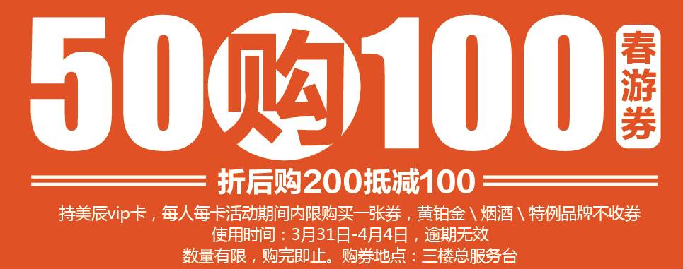 2.100元春游券限折后购物满200抵减100元使用