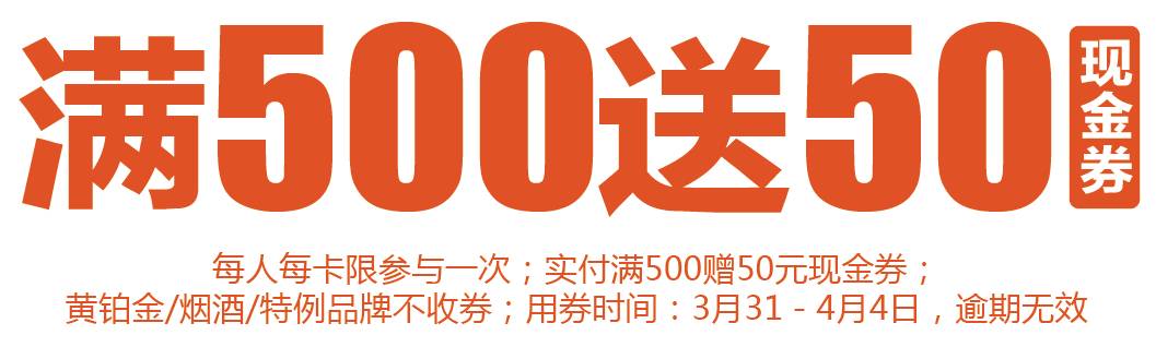 2.限当日实付满500元即赠50元现金券