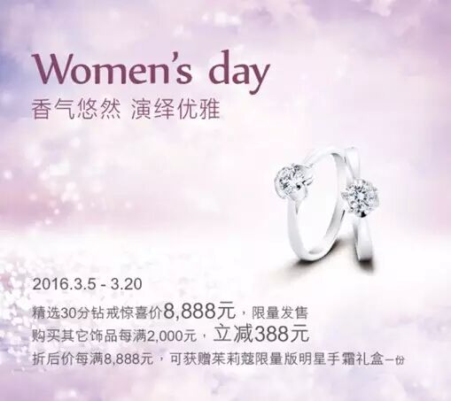 1、精选30分钻戒惊喜价8888元,限量发售。